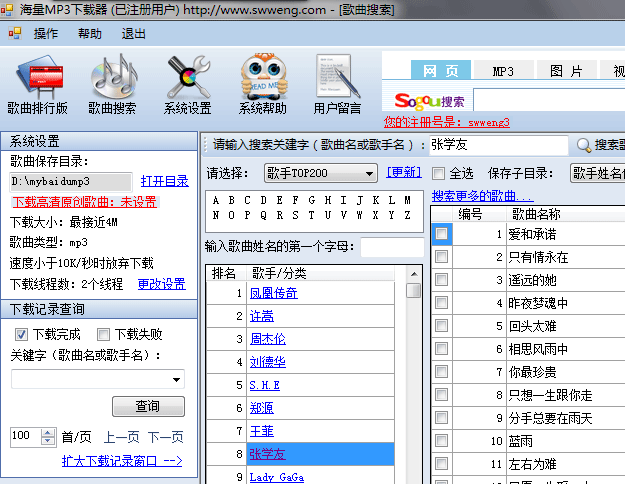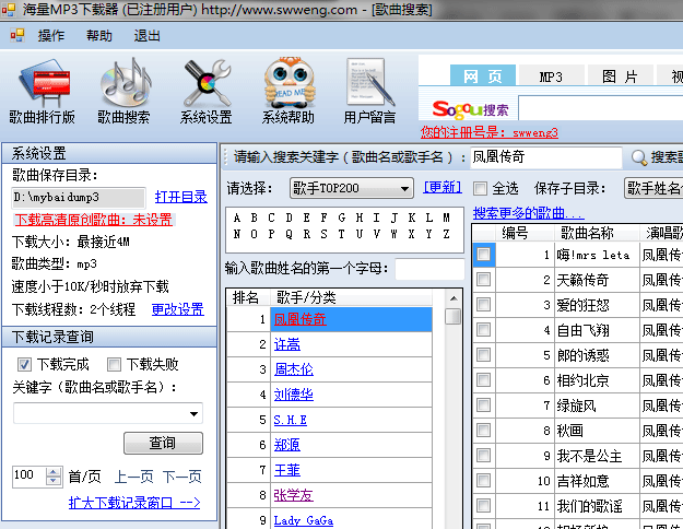 2.只要設(shè)置好歌曲類型(mp3、wma、rm)和歌曲大小,系統(tǒng)將按您的設(shè)置下載符合要求的歌曲。