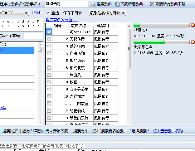 3、選中歌曲后,點(diǎn)擊“下載所選歌曲”按鈕,即開(kāi)始下載,窗口右邊出現(xiàn)下載進(jìn)度條,“下載所選歌曲”旁邊出現(xiàn)“取消所有歌曲下載”和“暫停下載”按鈕,可以按此按鈕對(duì)下載的歌曲進(jìn)行控制。