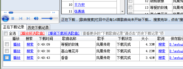 下載歌曲時(shí),默認(rèn)的是正在下載的記錄。如果你想了解你以往的下載情況,請(qǐng)點(diǎn)擊"歷史下載記錄"按鈕。點(diǎn)擊"歷史下載記錄"按鈕后,你以前的下載記錄將清晰的顯示在下邊.然后你可以選擇你想要聽(tīng)的歌曲,點(diǎn)擊"播放 所選歌曲"按鈕,就可以對(duì)您選擇的所有歌曲進(jìn)行播放。同時(shí),你也可以選擇你不想保留在歷史下載記錄里的歌曲,然后點(diǎn)擊"清除所選下載記錄""清除文件不存在的下載記錄"按鈕,對(duì)你不想保留的歌曲進(jìn)行刪除。