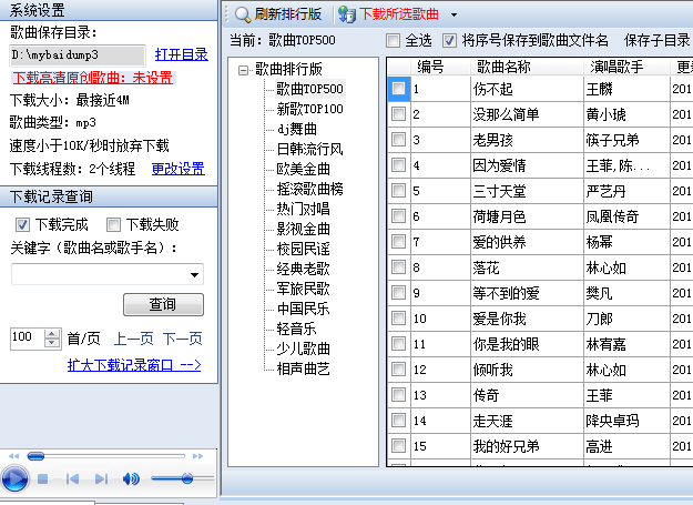 6、點(diǎn)擊最上邊的"歌曲排行版"按鈕,進(jìn)入歌曲排行版頁(yè)面。下圖為“歌曲TOP500”排行版 。選擇喜愛(ài)的歌曲后,點(diǎn)擊“下載所選歌曲”按鈕,即可下載相應(yīng)的歌曲 (自動(dòng)將下載下來(lái)的歌曲重命名為“歌手名-歌曲名.*”,保存到您設(shè)定的目錄中 ,排行版歌曲下載可將歌曲排名序號(hào)保存到文件名中,即“序號(hào)-歌手名-歌曲名.*”。 并可設(shè)置歌曲保存的子目錄,方便歌曲的分類,可以以下面三種方式設(shè)置子目錄:1、歌手姓名,2、排行版名稱、3、用戶自建。)