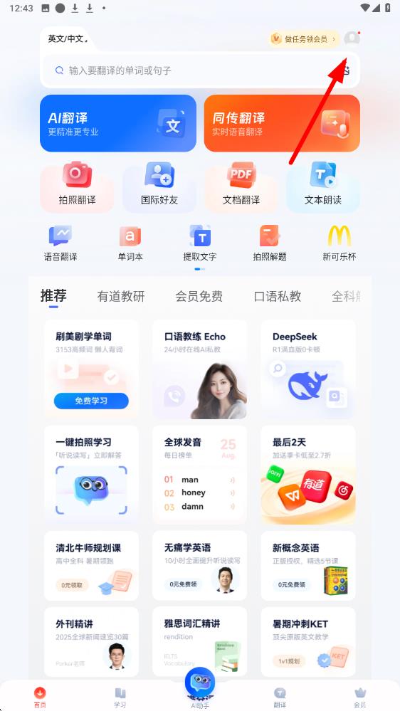 1、打開網(wǎng)易有道app,進(jìn)入首頁(yè)后點(diǎn)擊右上角頭像區(qū)域,進(jìn)入個(gè)人頁(yè)面。