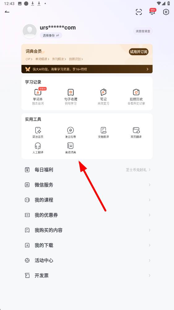 2、在個(gè)人頁(yè)面中,找到實(shí)用工具板塊,點(diǎn)擊其中的離線詞典選項(xiàng),進(jìn)入離線數(shù)據(jù)包下載頁(yè)面。