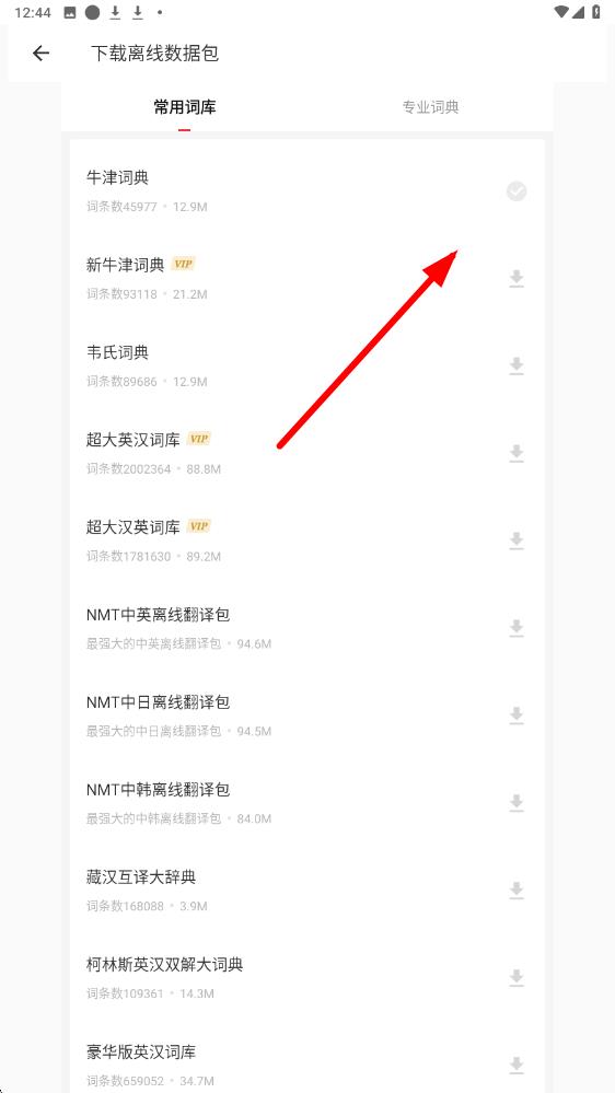 3、在下載離線數(shù)據(jù)包頁(yè)面,選擇你需要的詞典,點(diǎn)擊其右側(cè)的下載按鈕,下載完成后,在無(wú)網(wǎng)絡(luò)狀態(tài)下輸入要翻譯的單詞或句子,即可實(shí)現(xiàn)離線翻譯。