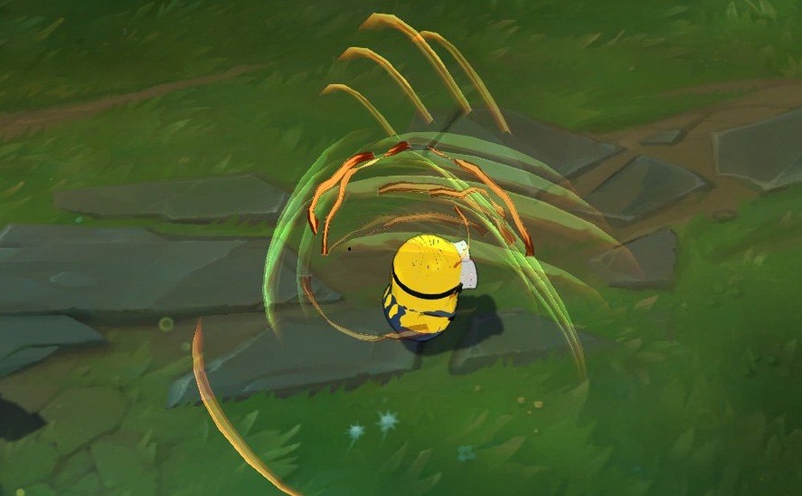 Q技能的木乃伊的繃帶,現(xiàn)在已經(jīng)成了小黃恩的黃色絲帶,黃色絲帶的顏色和小黃人的顏色非常搭配。