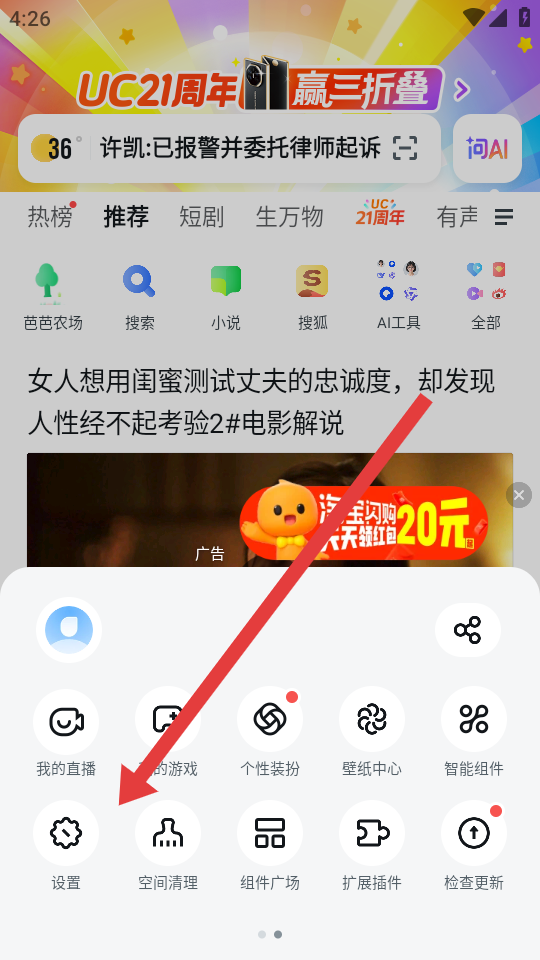 1、點(diǎn)擊下方圖標(biāo)進(jìn)入U(xiǎn)C瀏覽器功能菜單,找到并點(diǎn)擊設(shè)置圖標(biāo),進(jìn)入設(shè)置的界面。