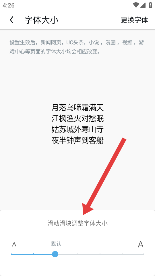 3、在字體大小頁(yè)面內(nèi),滑動(dòng)底部滑塊即可調(diào)整字體大小,設(shè)置生效后多類頁(yè)面字體將同步改變。