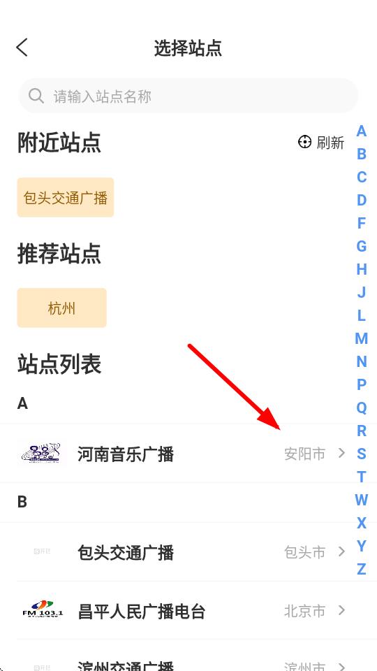 3、在選擇站點(diǎn)的頁面,我們需要選擇目標(biāo)電臺,如河南音樂廣播。