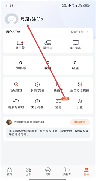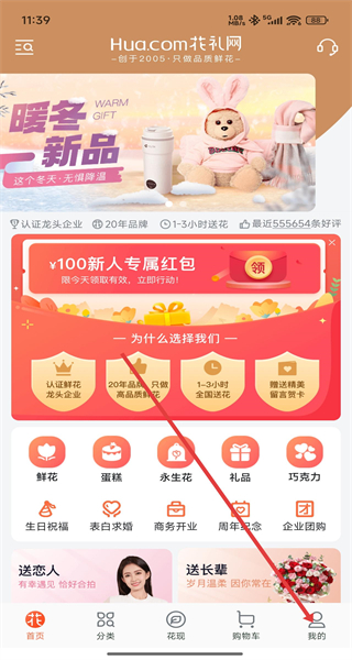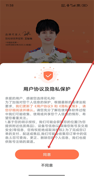 1、在打開App后,通過點擊彈窗中的同意按鈕,進入花禮網(wǎng)首頁。