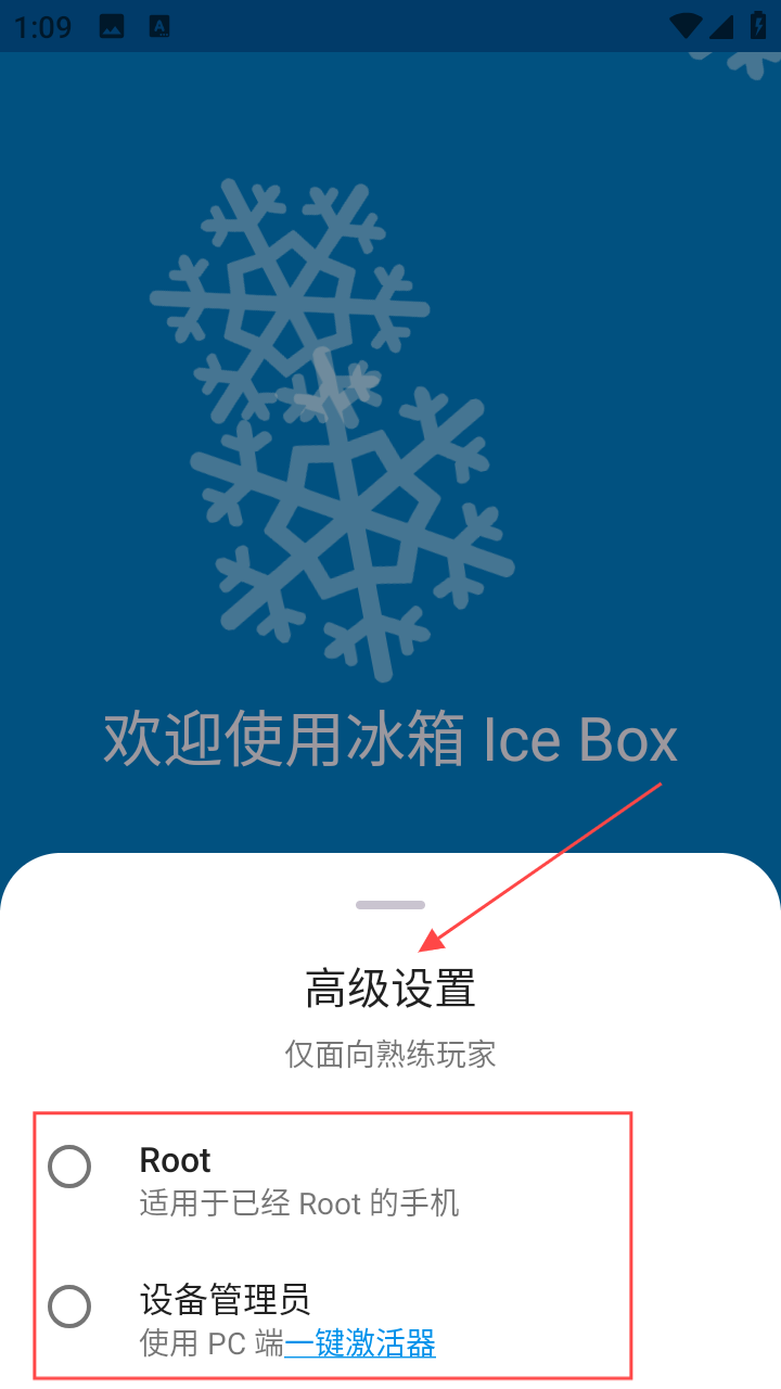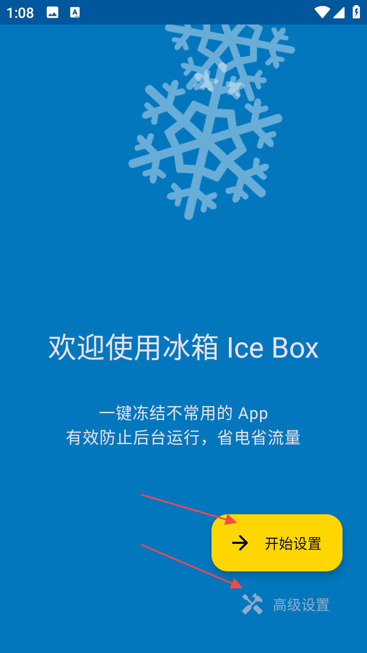 1、打開冰箱IceBox應(yīng)用進(jìn)入歡迎界面,此時能看到開始設(shè)置和高級設(shè)置兩個選項,根據(jù)自身需求選擇合適的入口開始后續(xù)操作。
