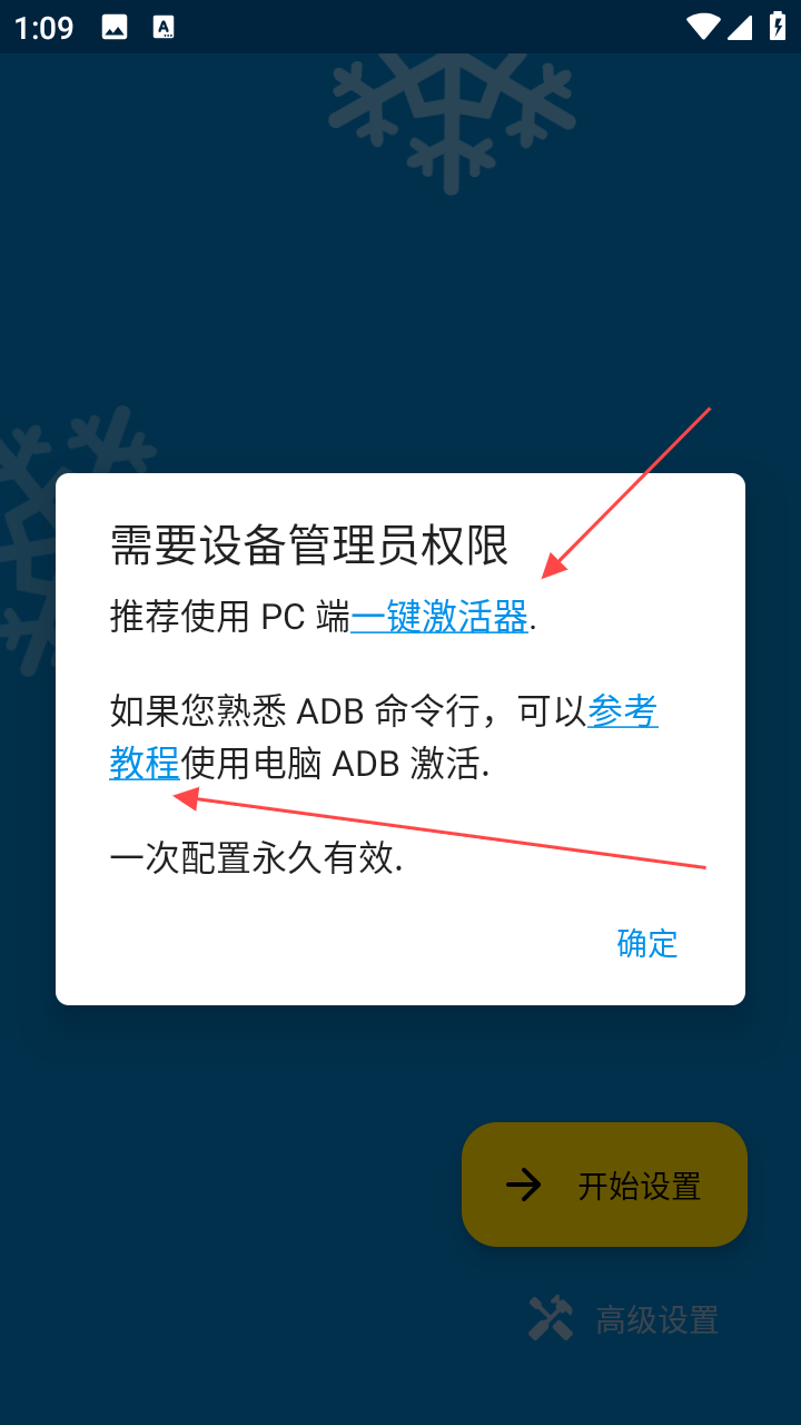 2、點擊開始設(shè)置后如果彈出需要設(shè)備管理員權(quán)限提示框,點擊提示框中的相關(guān)鏈接獲取對應(yīng)工具或教程,完成權(quán)限獲取后即可正常使用應(yīng)用凍結(jié)功能。