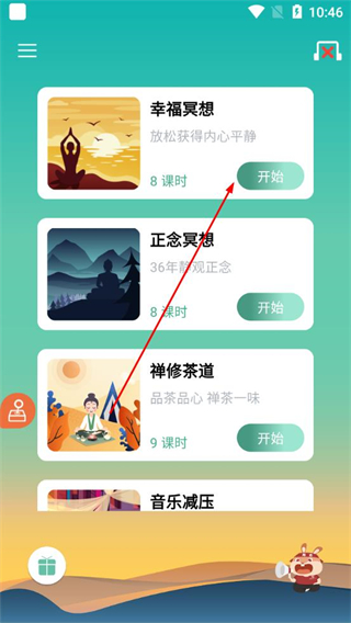 1、打開8分鐘冥想APP主界面,選擇目標(biāo)課程并點擊右側(cè)開始,進(jìn)入課程介紹頁。