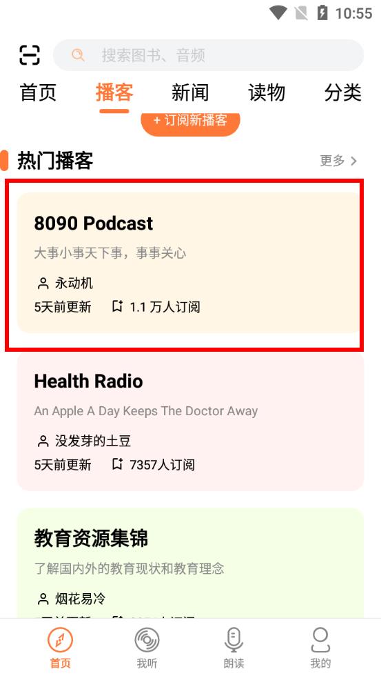 1、打開相關(guān)音頻類App,點(diǎn)擊底部導(dǎo)航欄的首頁,在首頁上方點(diǎn)擊播客選項(xiàng)進(jìn)入播客界面。