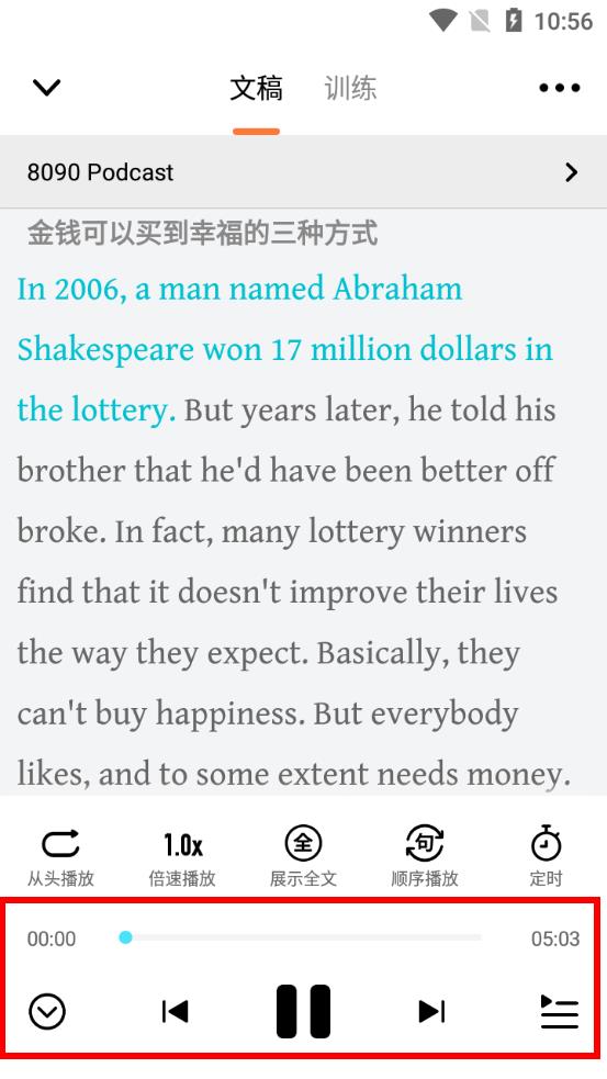3、進(jìn)入所選播客頁面后,瀏覽節(jié)目列表,點(diǎn)擊想收聽的節(jié)目,比如金錢可以買到幸福的三種方式。