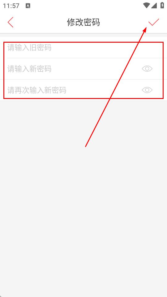 4、在修改密碼頁面,輸入舊密碼、新密碼,再次輸入新密碼進,點擊對勾圖標即可。