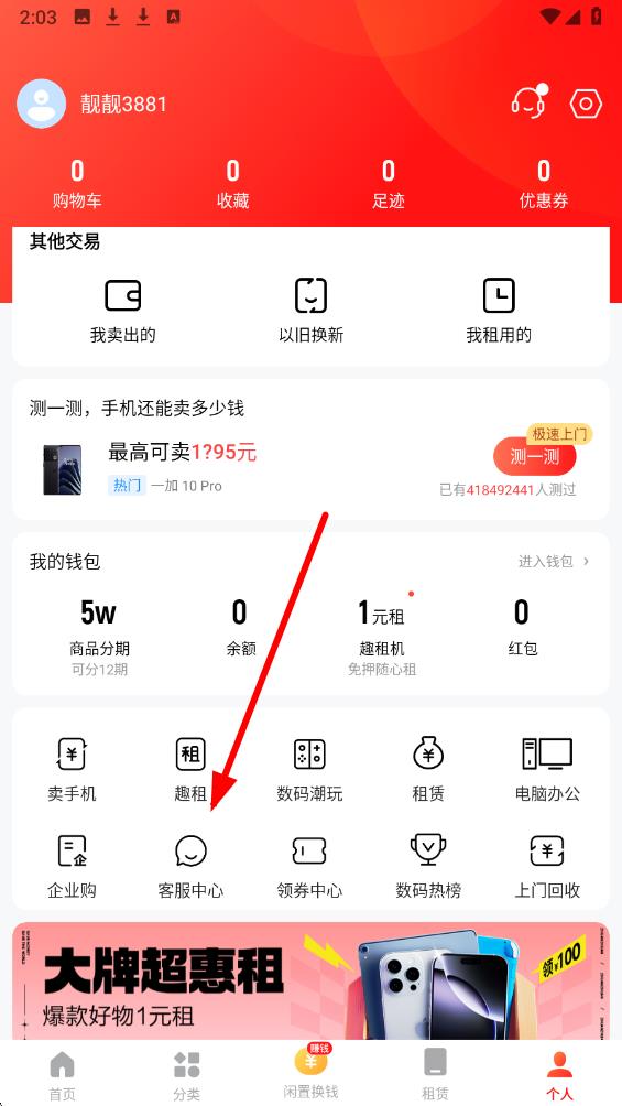 1、打開找靚機(jī)APP進(jìn)入個(gè)人頁面,在下方眾多功能選項(xiàng)中,點(diǎn)擊客服中心按鈕,進(jìn)入在線客服對話界面。