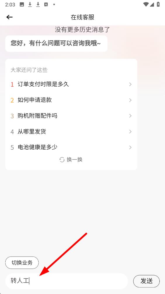 2、進(jìn)入在線客服界面后,在輸入框中輸入轉(zhuǎn)人工,然后點(diǎn)擊發(fā)送按鈕,向智能客服發(fā)送轉(zhuǎn)接人工客服的請求。