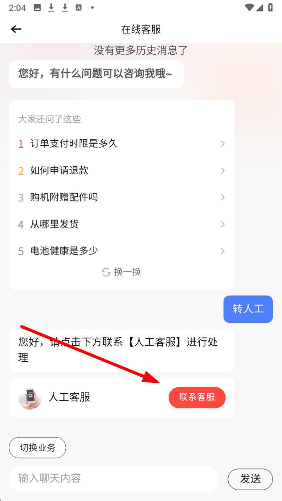 3、發(fā)送轉(zhuǎn)人工指令后,根據(jù)智能客服回復(fù)的提示,點(diǎn)擊人工客服欄對應(yīng)的聯(lián)系客服按鈕,即可等待接入人工客服進(jìn)行咨詢。