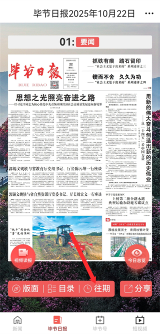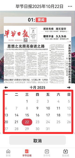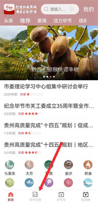 1、在新畢節(jié)APP首頁,點(diǎn)擊底部畢節(jié)日?qǐng)?bào),進(jìn)入畢節(jié)日?qǐng)?bào)專屬頁面。