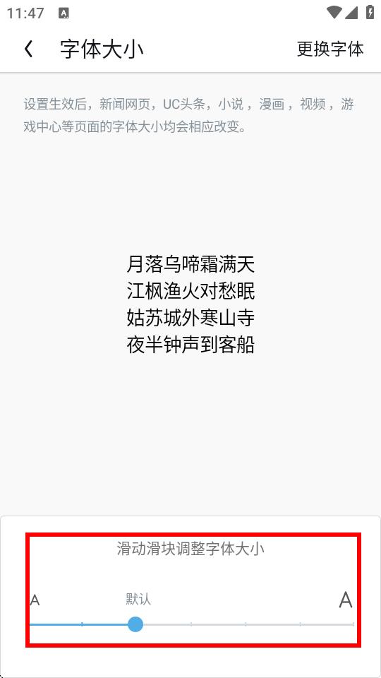 4、進入字體大小調(diào)整頁面后,通過滑動下方的滑塊來調(diào)整字體大小,設置會自動保存。