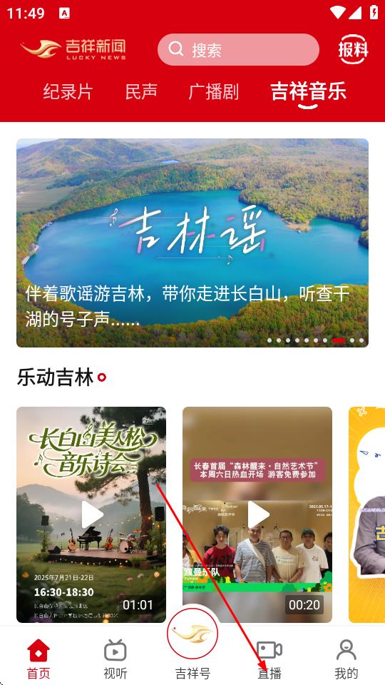 1、打開吉祥新聞App,點(diǎn)擊底部導(dǎo)航欄中的直播選項(xiàng)。