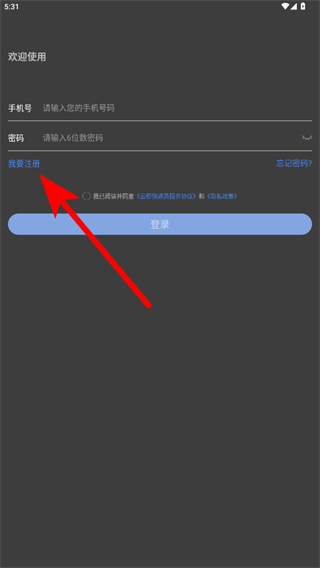 1、打開云柜快遞員APP,在登錄頁面點擊我要注冊,進(jìn)入注冊界面。
