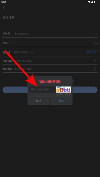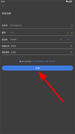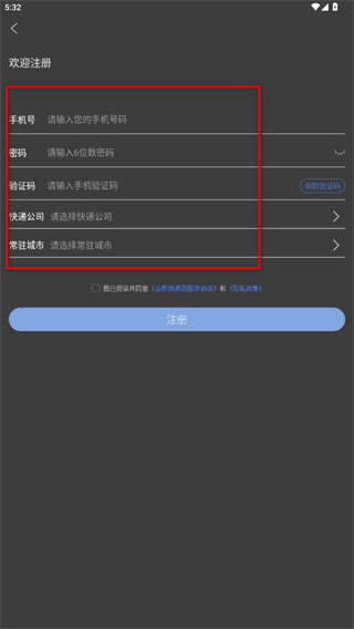 2、在注冊界面填寫手機(jī)號、密碼,獲取并輸入手機(jī)驗證碼,選擇快遞公司和常駐城市。