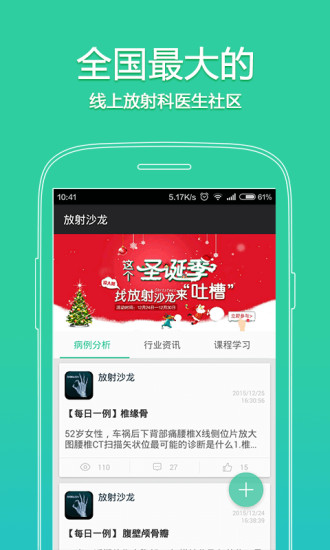 放射沙龍app是一款專注放射行業(yè)人士打造的學(xué)習(xí)交流平臺(tái),為每一位用戶提供更優(yōu)質(zhì)的資訊信息,與權(quán)威醫(yī)師在線交流,提升個(gè)人職業(yè)能力,歡迎在綠色資源網(wǎng)下載體驗(yàn)。