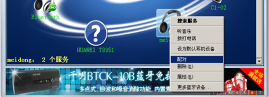 右鍵點擊meidong,出現(xiàn)配對及搜索服務(wù)等欄, 點擊配對時若需密碼,則默認密碼為:0000