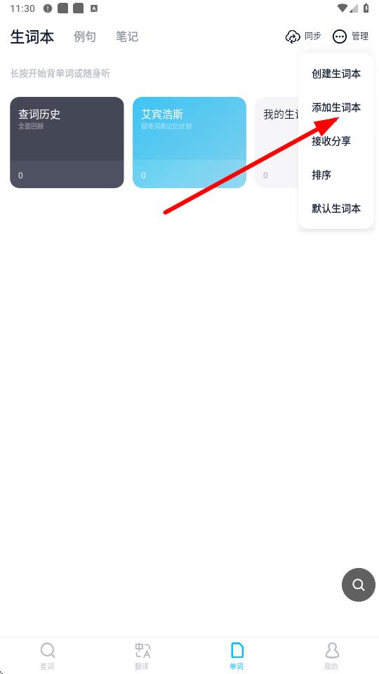2、在彈出菜單中,點(diǎn)擊添加生詞本選項(xiàng)。