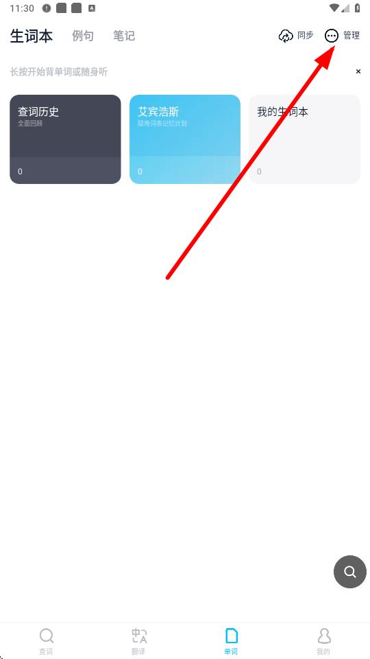 1、打開金山詞霸,點(diǎn)擊底部單詞,進(jìn)入生詞本頁(yè)面,點(diǎn)擊右上角管理。