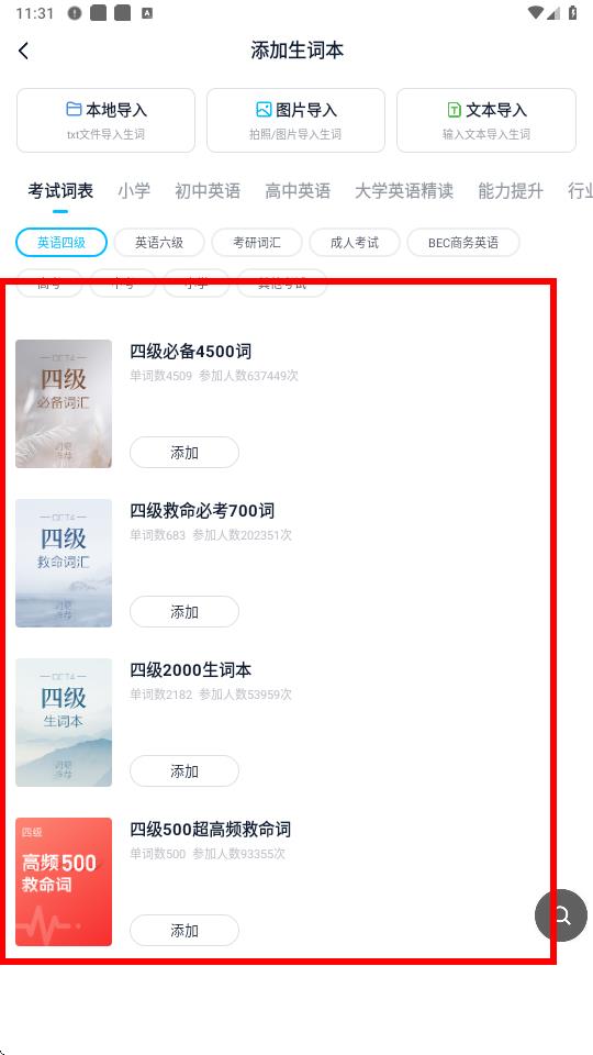 3、在添加生詞本頁(yè)面,選擇如四級(jí)必備4500詞等所需詞表,點(diǎn)擊添加即可加入生詞本。