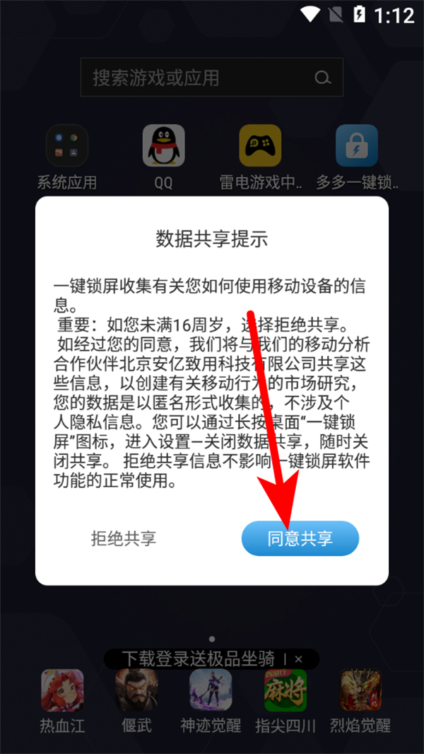 1、在手機(jī)一鍵鎖屏提示界面,點擊同意共享按鈕,進(jìn)入權(quán)限開啟提示頁面。