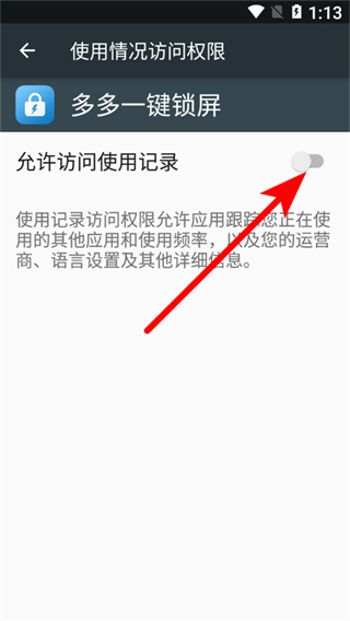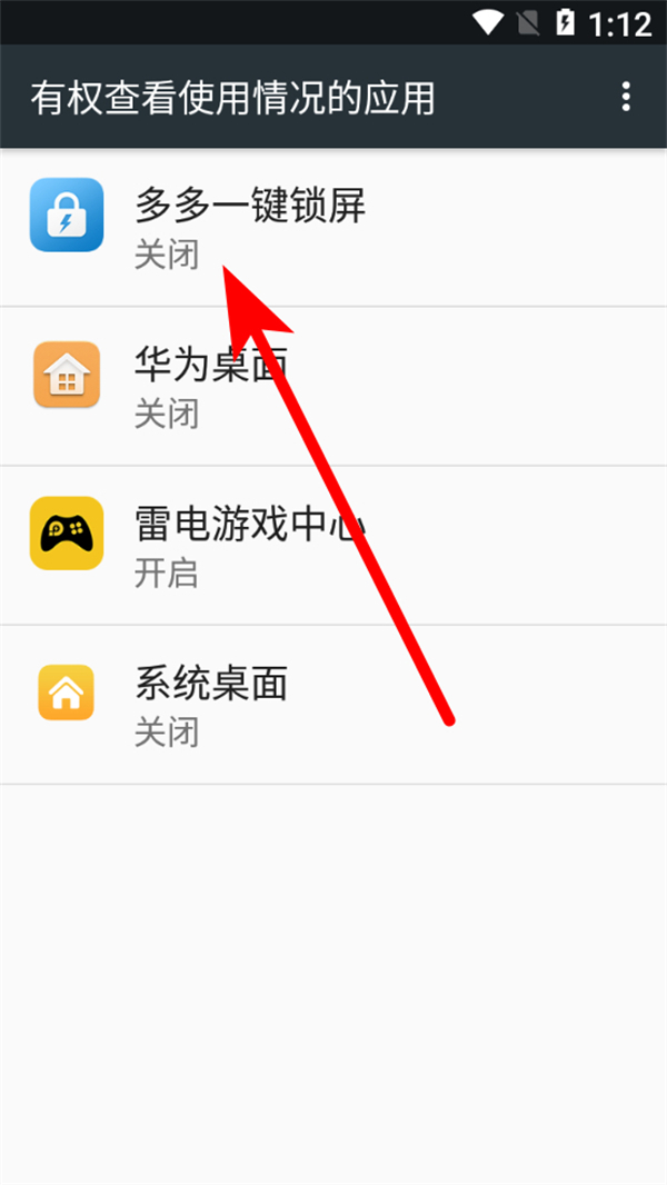 3、在有權(quán)查看使用情況的應(yīng)用列表頁面,點擊多多一鍵鎖屏選項,進(jìn)入使用情況訪問權(quán)限設(shè)置頁面。