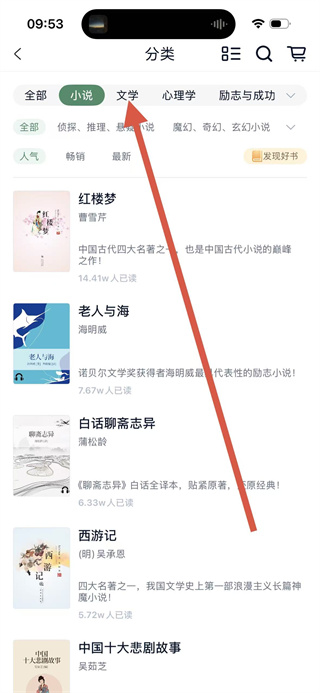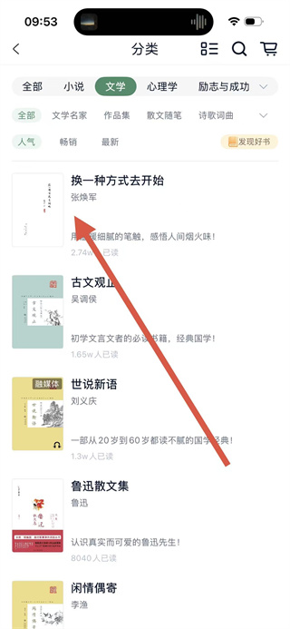 2、在分類頁面,點擊文學選項,進入文學書籍列表頁面。