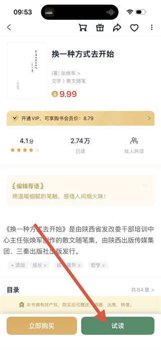 4、在書籍詳情頁面,點擊試讀按鈕,即可開始閱讀該書籍。