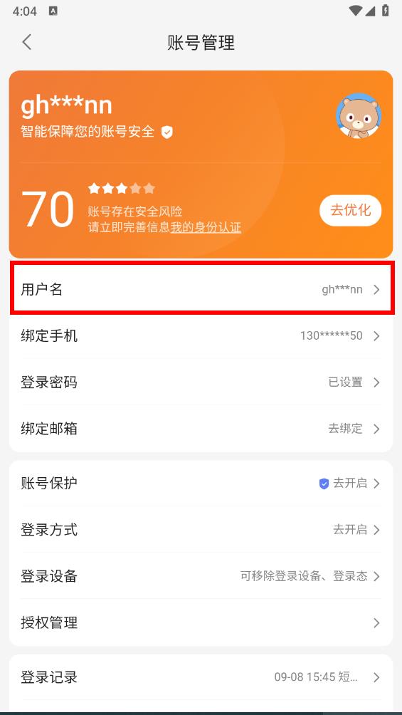 4、在賬號管理界面中點擊用戶名選項,進入用戶名修改頁面,點擊修改用戶名,按照提示輸入新昵稱完成修改。