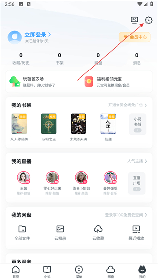 1、進(jìn)入U(xiǎn)C瀏覽器我的頁(yè)面,點(diǎn)擊右上角齒輪狀設(shè)置圖標(biāo),進(jìn)入設(shè)置的界面。