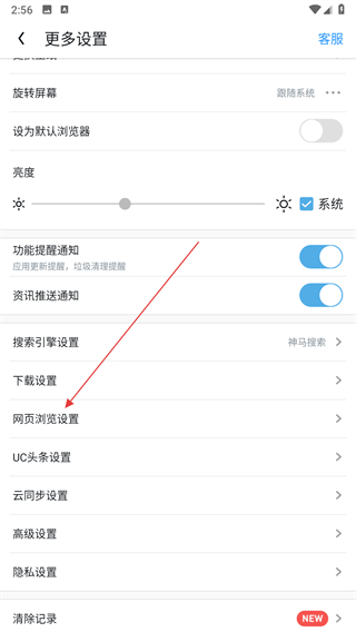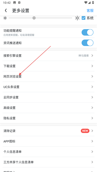 3、在更多設(shè)置頁(yè)面找到網(wǎng)頁(yè)瀏覽設(shè)置選項(xiàng),點(diǎn)擊進(jìn)入網(wǎng)頁(yè)瀏覽設(shè)置。