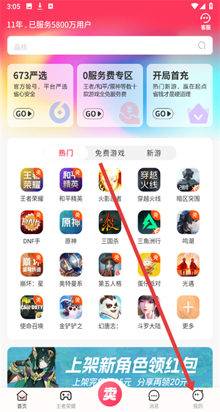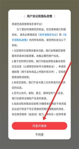 1、點(diǎn)擊“用戶協(xié)議和隱私政策”彈窗的“同意并繼續(xù)”,進(jìn)入淘手游主界面。