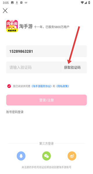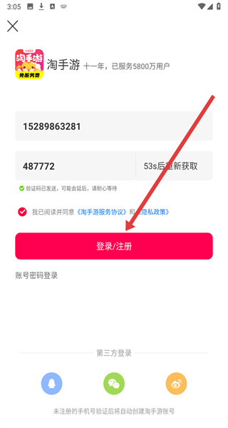 4、輸入收到的短信驗(yàn)證碼,點(diǎn)擊“登錄/注冊(cè)”按鈕,完成賬號(hào)登錄。