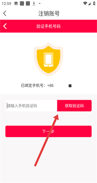 4、在驗(yàn)證手機(jī)號(hào)碼頁面點(diǎn)擊“獲取驗(yàn)證碼”,輸入收到的驗(yàn)證碼后點(diǎn)擊“下一步”,完成賬號(hào)注銷操作。
