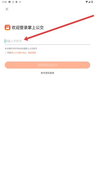 3、進入掌上公交登錄界面,在請輸入手機號欄填寫號碼,開啟登錄步驟,以便后續(xù)補簽。