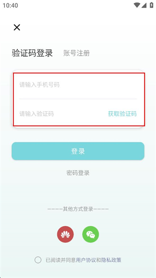 3、在驗證碼登錄界面的輸入框中,依次填寫手機號碼和對應的驗證碼,準備完成登錄信息填寫。
