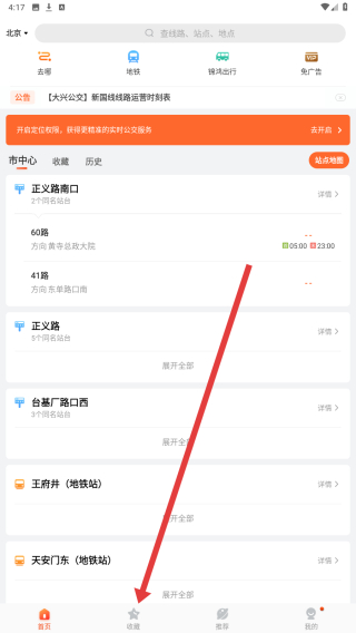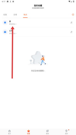 1、在公交應(yīng)用首頁點擊底部收藏按鈕,進入我的收藏頁面,可查看已保存添加的地點信息,方便后續(xù)快速調(diào)用。