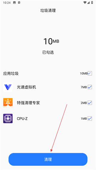 1、打開特強(qiáng)清理專家APP,會(huì)自動(dòng)掃描手機(jī)內(nèi)的垃圾文件,點(diǎn)擊上方的一鍵清理。