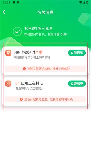 4、到達(dá)結(jié)算界面,可根據(jù)需求選擇立即提速或立即省電等功能進(jìn)一步優(yōu)化手機(jī)。