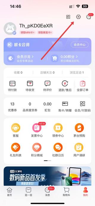 2、進入我的頁面后,點擊右上角的設置圖標。