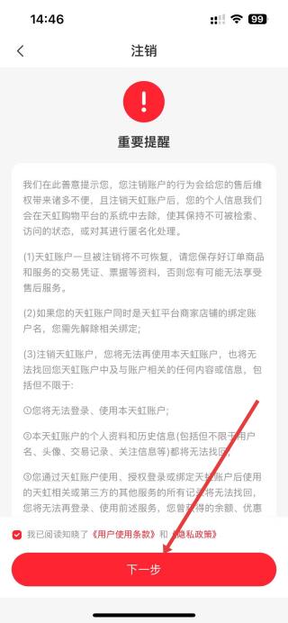 5、在頁面閱讀重要提醒后,勾選同意相關條款,再點擊下一步,按照提示完成賬號注銷。