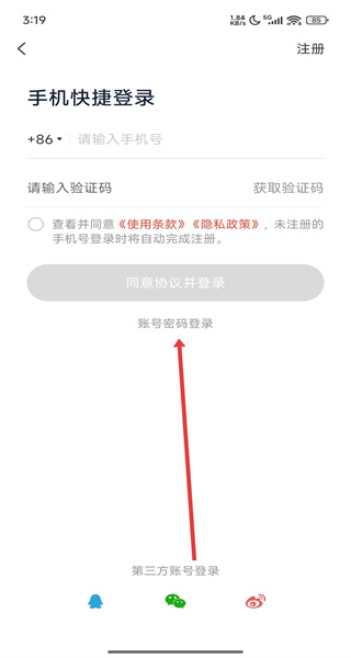 2、在登錄界面選擇賬號密碼登錄,進入對應登錄頁面。