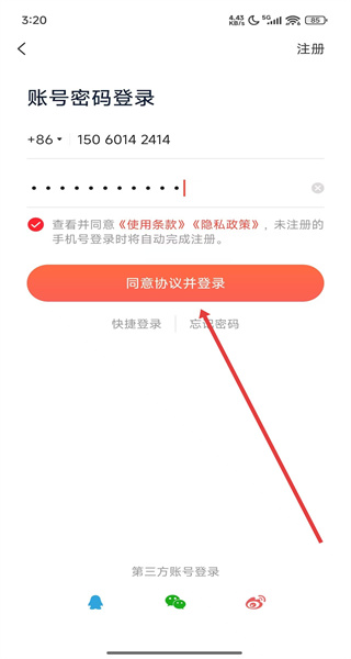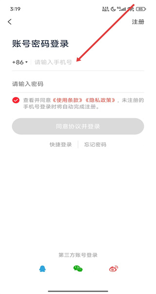 3、在頁面的手機號輸入框填寫號碼,再在密碼欄輸入登錄密碼。